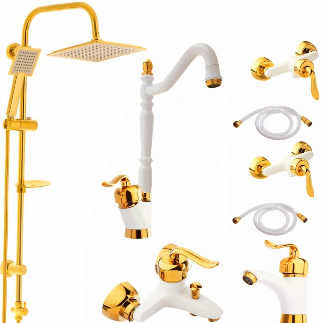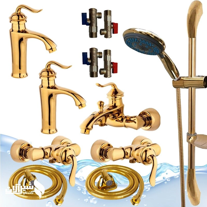ست ۵ عددی شیرآلات برند آیدا صنعت مدل قهرمان | شیر روشویی + شیر ظرفشویی بیزانس دومنظوره + شیر توالت + شیر حمام + شلنگ توالت | طلایی براق۱۰۰٬۰۰۰٬۰۰۰ تومان