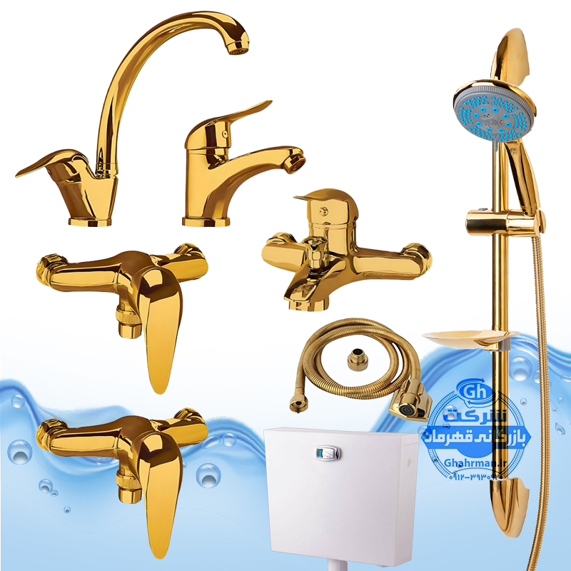 ست ۸ عددی شیرآلات برند آیدا صنعت مدل قهرمان اردکی | شیر ظرفشویی + دو عدد روشویی + حمام + دو عدد توالت + علم دوش یونیکا + شلنگ توالت + فلاش تانک | طلایی براق۱۰۰٬۰۰۰٬۰۰۰ تومان