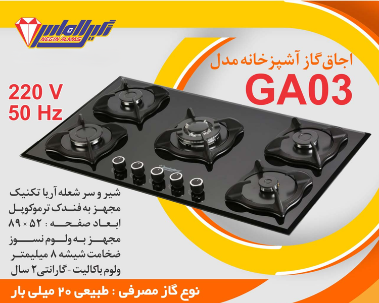 اجاق گاز صفحه شیشه ای نگین الماس کد GA03 ابعاد 89×52