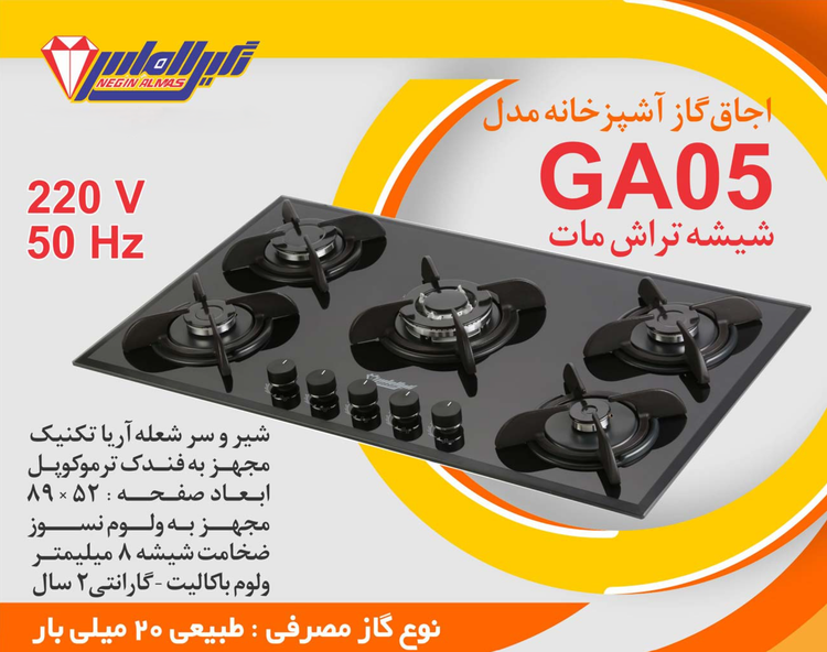 اجاق گاز صفحه شیشه ای نگین الماس کد GA05 ابعاد 52×89