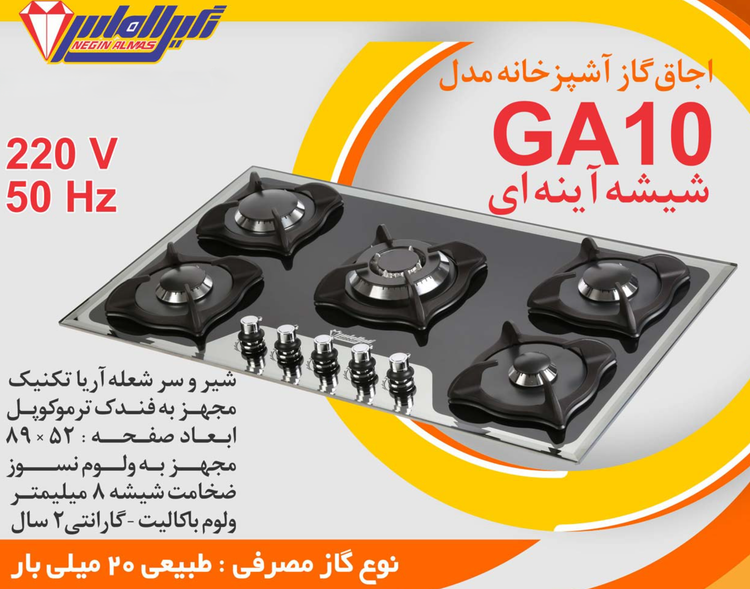 اجاق گاز صفحه شیشه ای نگین الماس کد GA10 ابعاد 52×89