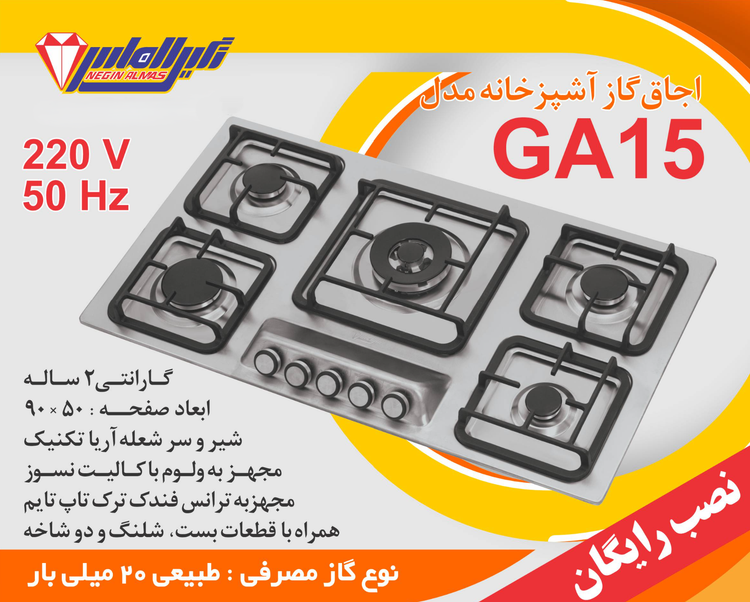 اجاق گاز صفحه استیل نگین الماس کد GA15 ابعاد 50×90