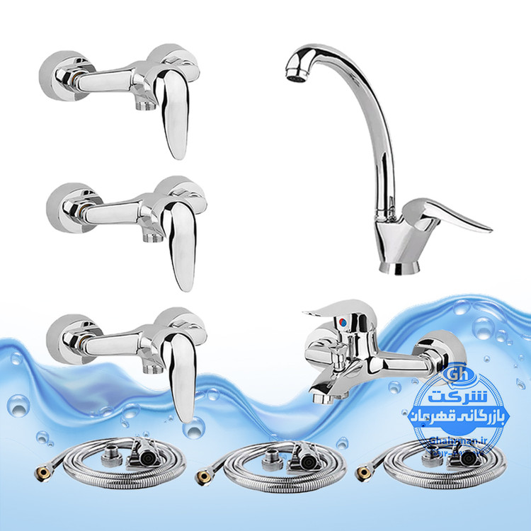 ست ۸ عددی شیرآلات برند آیدا صنعت مدل دنیز | شیر ظرفشویی + حمام + سه عدد توالت + سه شلنگ توالت | کروم براق