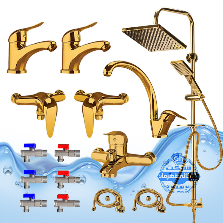 ست ۱۵ عددی شیرآلات برند آیدا صنعت مدل دنیز | شیر ظرفشویی + دو عدد شیر روشویی + شیر حمام + شیر توالت + علم دوش یونیورست مدل رسوبگیر اتومات + دو عدد شلنگ توالت + دو عدد شلنگ استیل + چهار عدد شیر پیسوار | طلایی براق