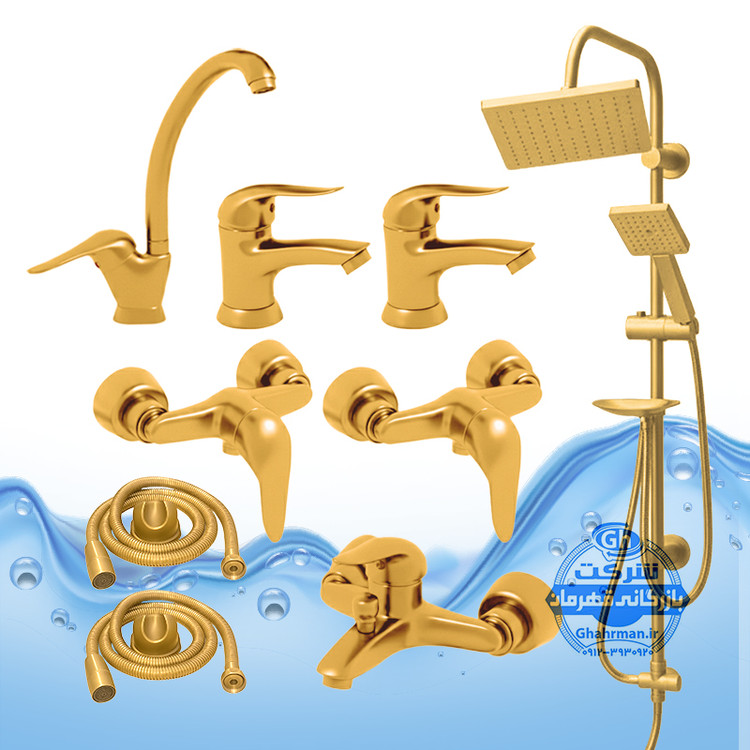 ست ۹ عددی شیرآلات برند آیدا صنعت مدل دنیز | شیر ظرفشویی + دو عدد روشویی + حمام + دو عدد توالت + علم دوش یونیورست رسوبگیر اتومات + دو شلنگ توالت | طلایی مات