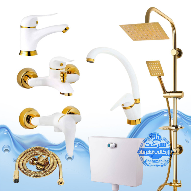 ست ۷ عددی شیرآلات برند آیدا صنعت مدل دنیز | سفید طلایی | علم دوش صفحه استیل