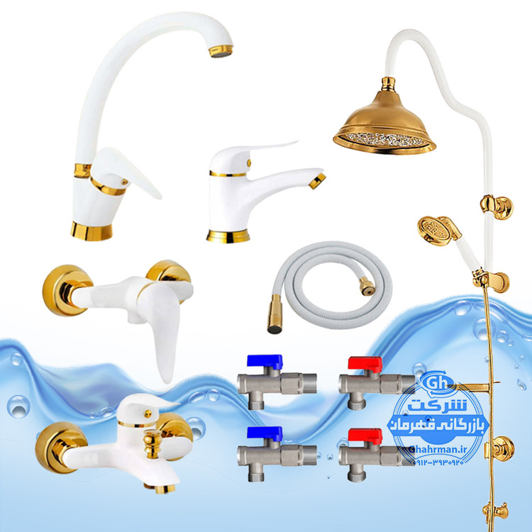 ست ۱۰ عددی شیرآلات برند آیدا صنعت مدل دنیز | شیر ظرفشویی + شیر روشویی + شیر حمام + شیر توالت + علم دوش شیپوری + شلنگ توالت + چهار عدد شیر پیسوار | سفید طلایی