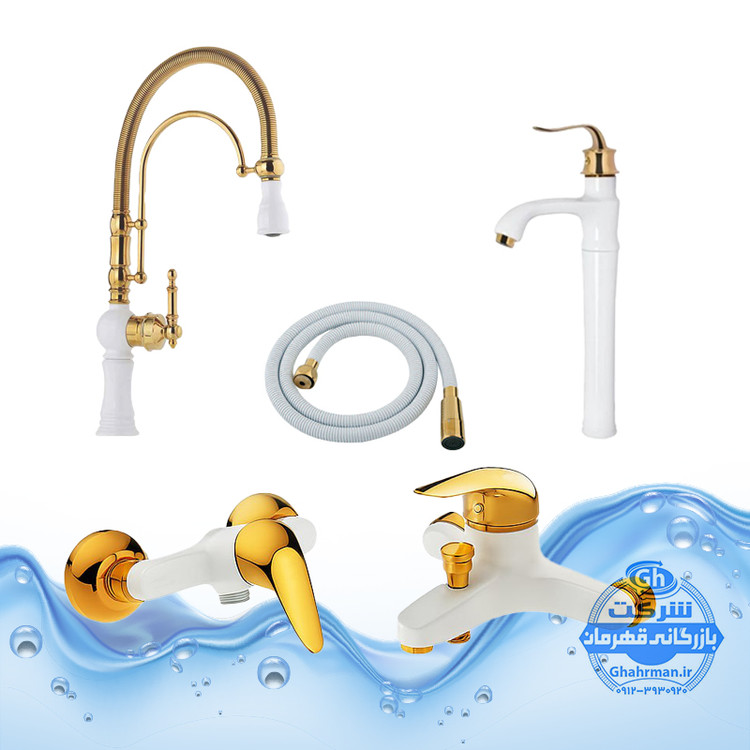 ست ۵ عددی شیرآلات برند آیدا صنعت مدل بیزانس و قهرمان | شیر روشویی پایهبلند + شیر ظرفشویی بیزانس تکمنظوره + شیر حمام + شیر توالت + شلنگ توالت | سفید طلایی