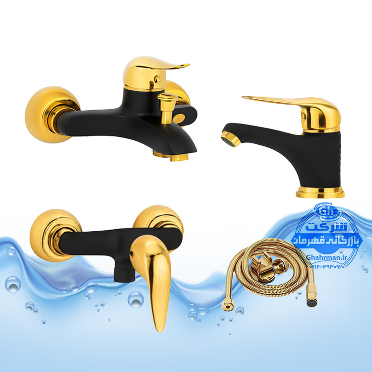 ست ۴ عددی شیرآلات مدل دنیز شامل شیر روشویی، توالت، حمام و شلنگ توالت | مشکی طلایی | شیرآلات برند آیدا صنعت