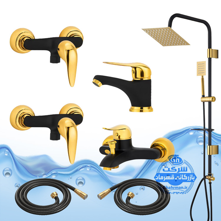ست ۷ عددی شیرآلات برند آیدا صنعت مدل دنیز |روشویی + حمام + توالت + علم دوش یونیورست صفحه استیل + ۲ عدد شلنگ توالت | مشکی طلایی
